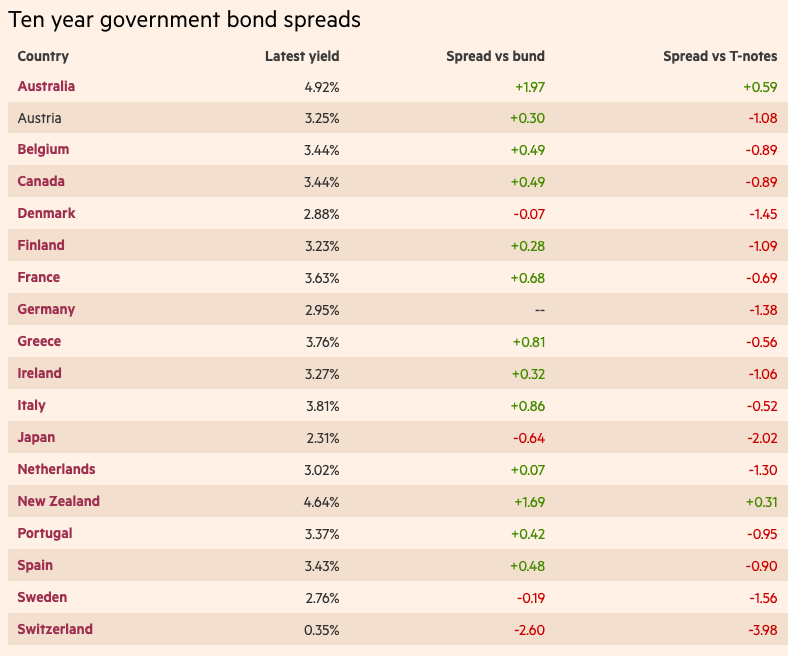 10-year government bond yields and spreads as at April 1 2026© LSEG/Financial Times