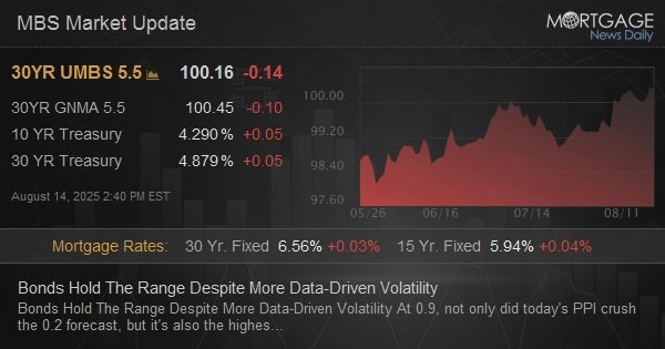 At 0.9, not only did today’s PPI crush the 0.2 forecast, but it’s also the highest reading since post-covid hyper-inflation by a wide margin. And while there’s always a chance it will be revised to something less alarming next month, it was enough to do noticeable damage to bonds today. Before the data, 10yr yields were knocking on the yield floor at 4.20%. This afternoon, they’re up closer to 4.30%. Things could have been even worse if not for the fact that the PCE components in the PPI data suggested a much less onerous impact on the PCE data that will come out in 2 weeks. Nonetheless, it will be enough to keep eyebrows raised regarding the extent to which tariffs are hindering a return to the 2% inflation target (something that will unfortunately be up in the air for many months).