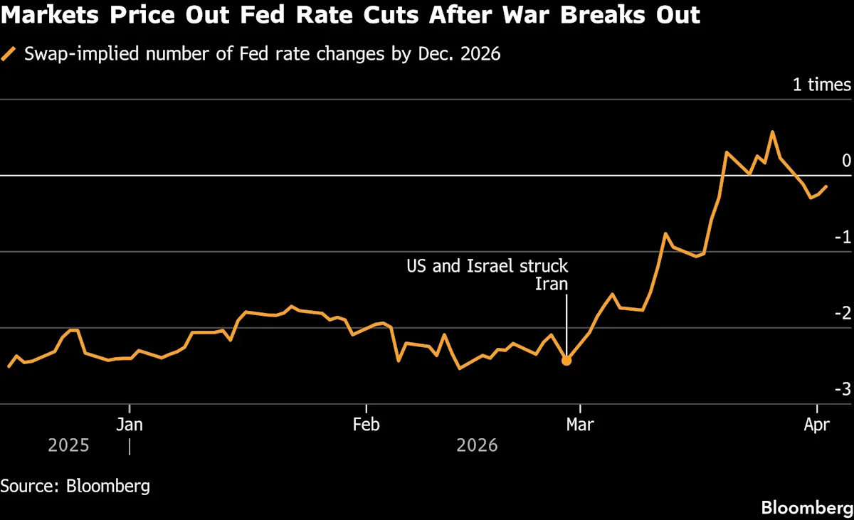 Before the war started on Feb. 28, overnight index swaps had priced in more than two quarter-point rate cuts this year. Those expectations were subsequently erased, and traders began to price in the chance that the Fed’s next move would be a rate increase. More recently, the market expects the Fed to stay on hold in 2026.