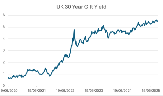 Despite the Bank of England lowering interest rates five times since August 2024 the 30-year gilt yield has risen.