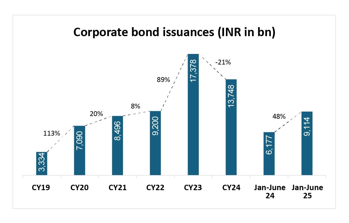 Over the past few years, corporate bond issuances in India have been on the rise. We have seen the issuance peaking in 2023 with an 89% YoY increase to ₹17,378 billion. The jump was likely driven by a combination of factors, including rising interest rates and an improving economic climate post Covid-19. The first half of CY 2025 so far too saw an impressive 48% YoY growth in corporate debt issuances. Companies, especially in sectors like real estate, infrastructure, and non-banking financial companies (NBFCs), have increasingly turned to the bond market to raise funds.