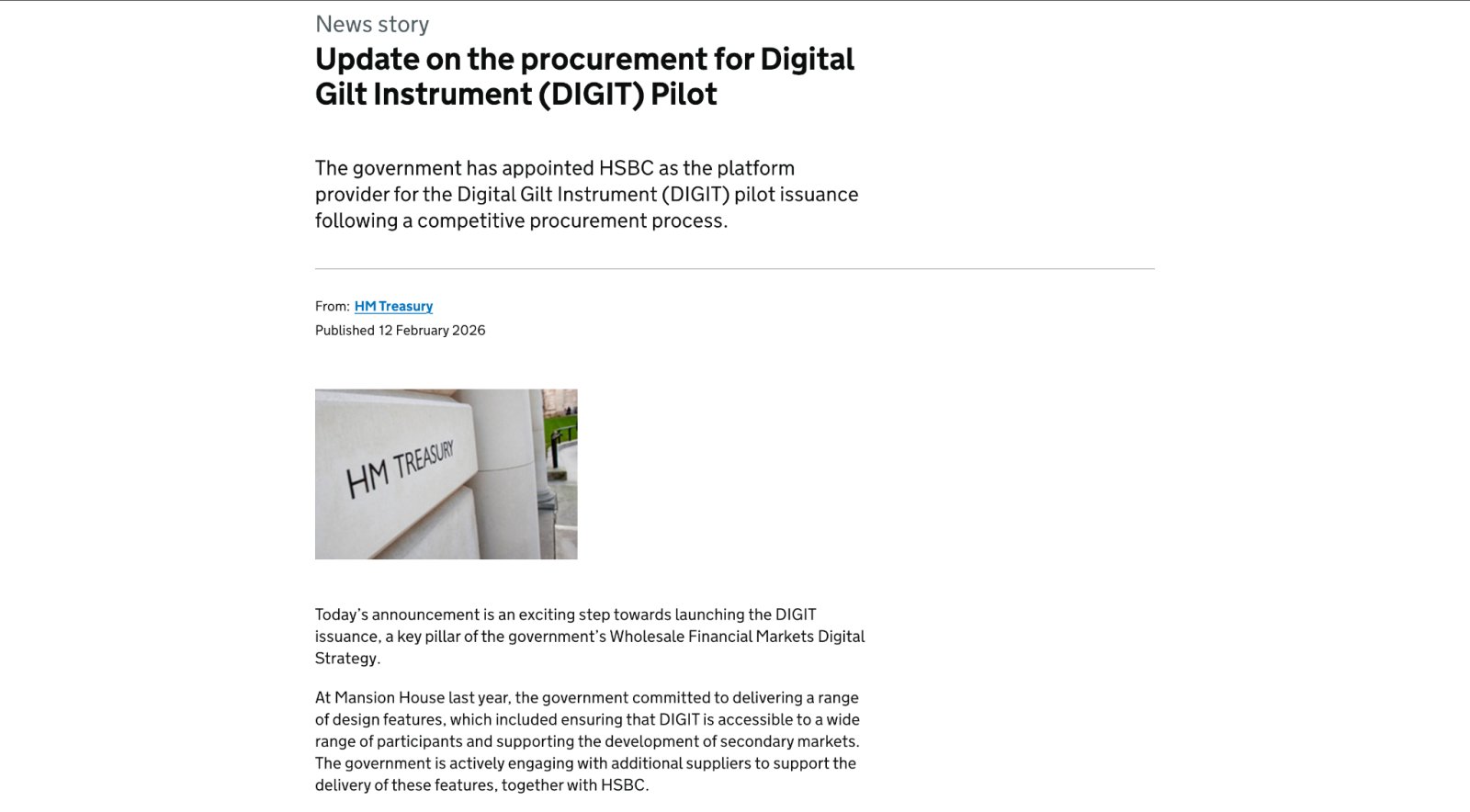 According to an announcement, the UK government has appointed HSBC to facilitate the Digital Gilt Instrument (DIGIT) pilot issuance. This initiative is part of a broader push to modernize sovereign debt markets using distributed ledger technology (DLT). The Treasury published a DIGIT pilot update in July 2025, outlining plans to explore blockchain applications in UK sovereign debt issuance and support the development of domestic tokenization infrastructure.