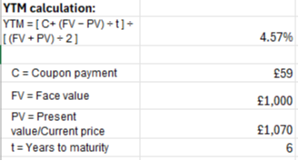 The current yield offers a snapshot of the yearly return, and is calculated by dividing the coupon by the bond’s current market price. For VO32, this means that £59 is divided by £1,070 to generate a current yield of 5.51 per cent. This is more of a short-term, income-focused metric.