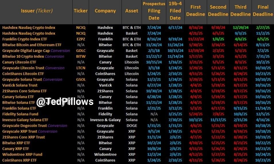 As per Ted Pillows on X (formerly Twitter), the decisions for Solana [SOL], Ripple [XRP], Dogecoin [DOGE], and Litecoin [LTC] ETFs were set for October.