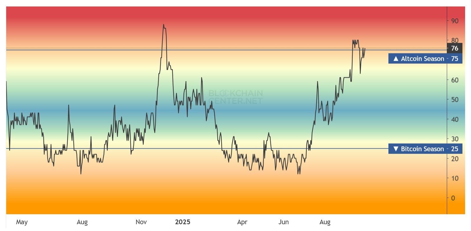 The press time reading of the altcoin season index was trading at the 76 mark, indicating the return of Altseason.