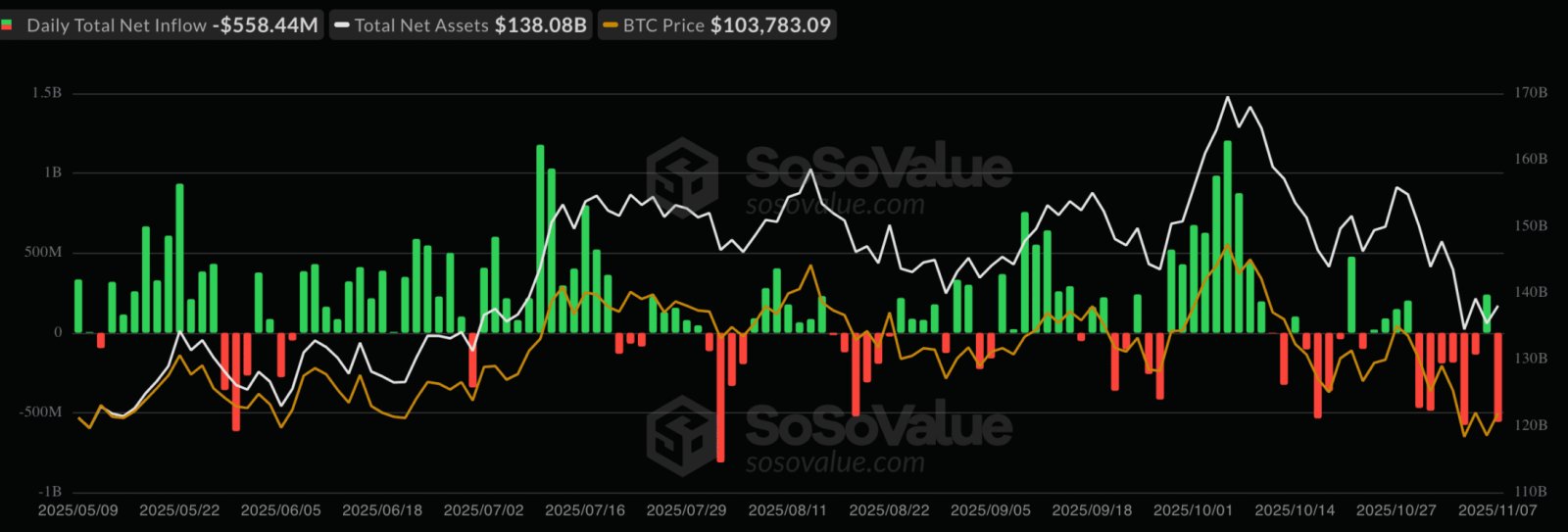 According to SoSoValue data, the fund saw $558.4 million in net outflows. This is the biggest daily drawdown since August 1. This comes as Bitcoin’s price continues to trade around $102,000.