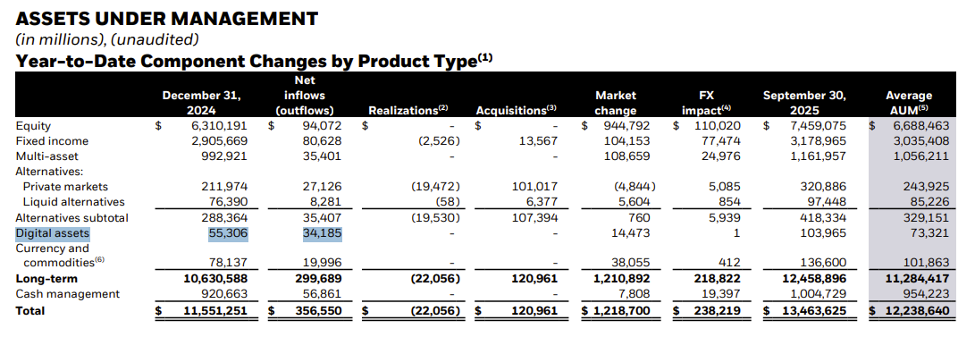 The firm’s digital asset ETFs recorded $17 billion in net inflows during the quarter, bringing the year-to-date total to $34 billion. As of September, total crypto assets under management (AUM) stood at nearly $104 billion, representing about 1% of BlackRock’s overall assets.