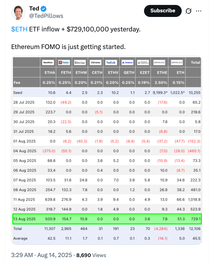Addressing the $729 million inflow in spot Ether ETFs, crypto market observer Ted Pillows suggested that the “Ethereum FOMO is just getting started” in an X post on Thursday.