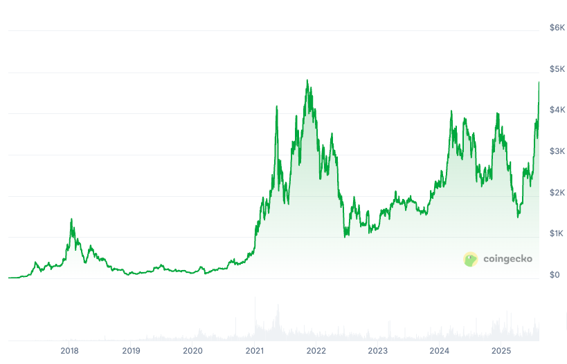 As of publication, Ether traded at $4,744, or about 3% away from the all-time high of $4,878 recorded on Nov. 21, 2021, according to historic prices data from CoinGecko.