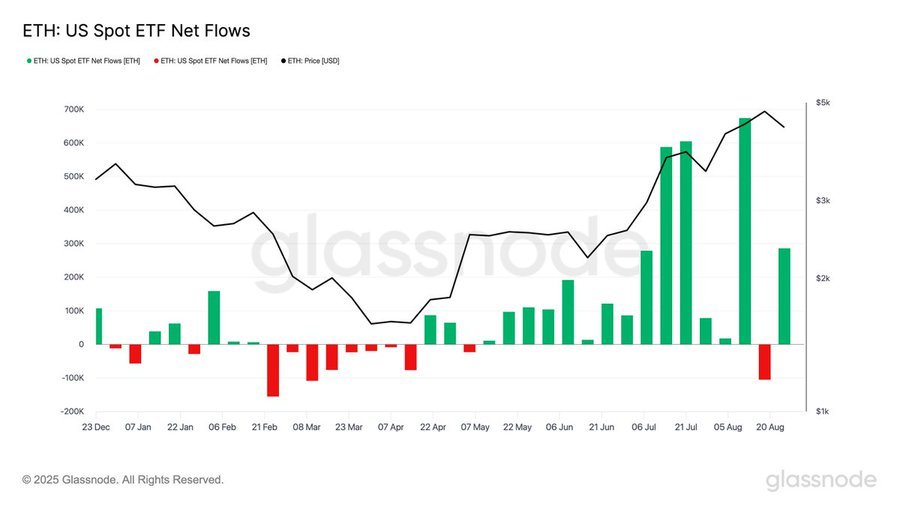 US spot Ethereum ETFs posted inflows of more than 286,000 ETH in one week. This is one of the largest totals since their launch. The ETH finished close to $4,400 and institutional demand did not wane. Glassnode analytics highlights steady inflows, enhancing the existence of a strong demand layer.