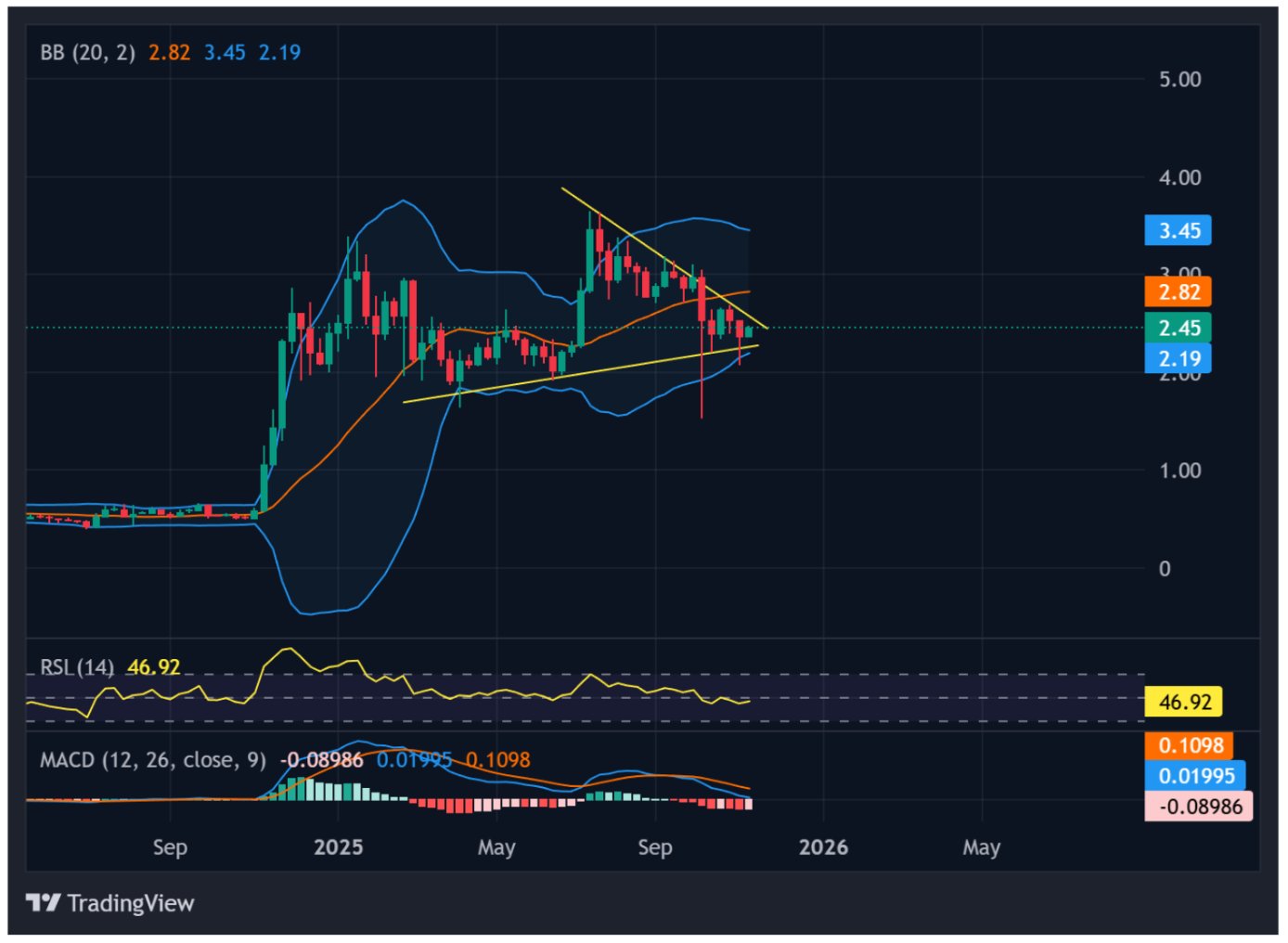 Immediate resistance is near $2.82, with a breakout above the upper wedge trendline opening the door toward $3.45 and potentially $4 in the near term.
