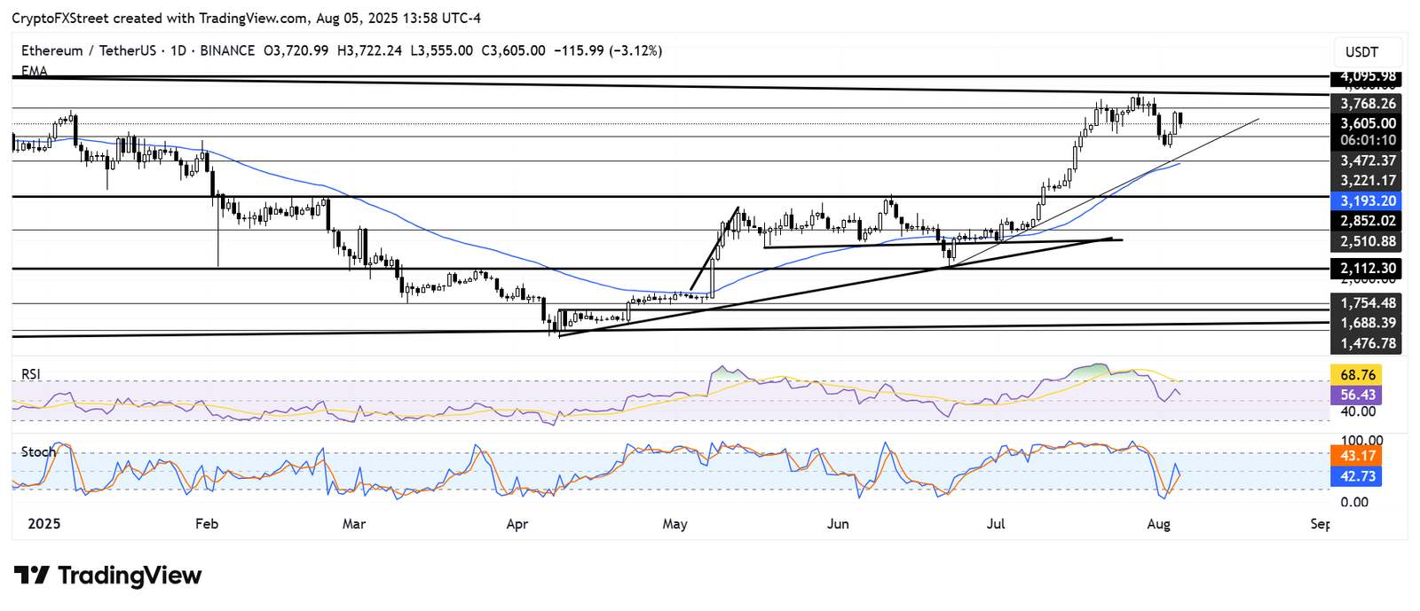 ETH could find support near a rising trendline — strengthened by the 50-day Exponential Moving Average (EMA) — extending from June 22. Just below this trendline is the $3,220 support. A breach of these levels could send ETH toward the $2,850 key level.