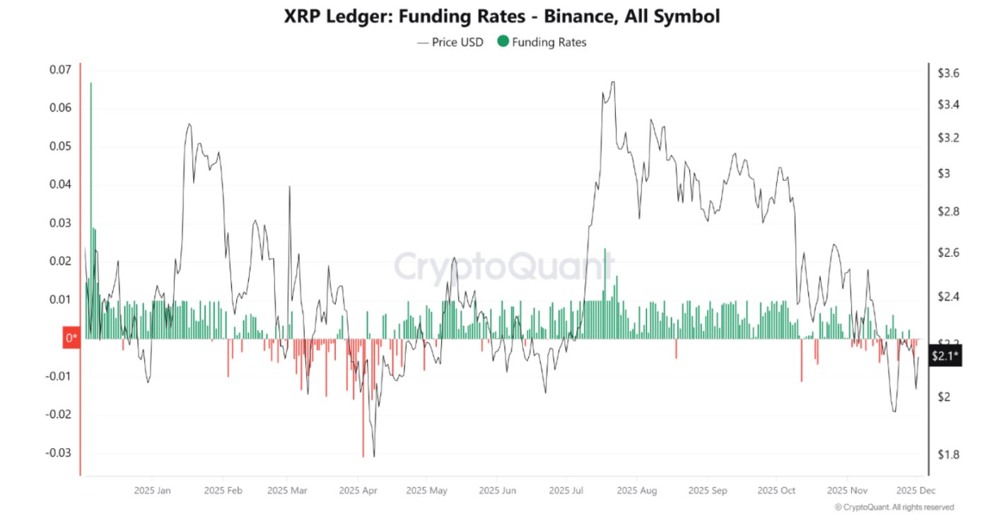 When more traders continue to open short positions, it becomes harder for buyers to gain control. Under these conditions, XRP could revisit the $2.0 to $1.9 region. A CryptoQuant analyst noted that if negative funding drops further, XRP may drift sideways in the short term.