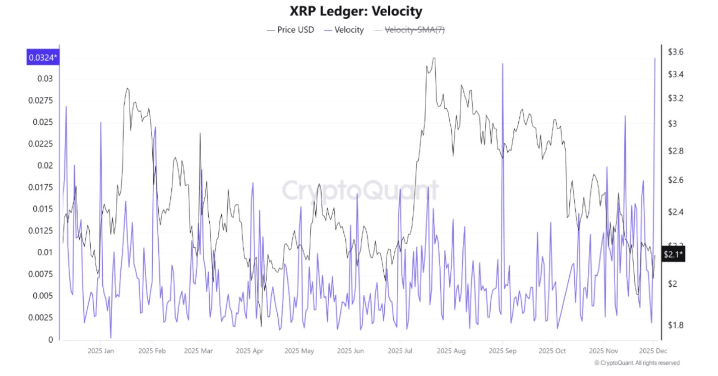 The XRP ledger also saw a sharp burst of activity on December 2. Circulation speed jumped to a yearly high of 0.0324 and pointed to strong movement across the network.