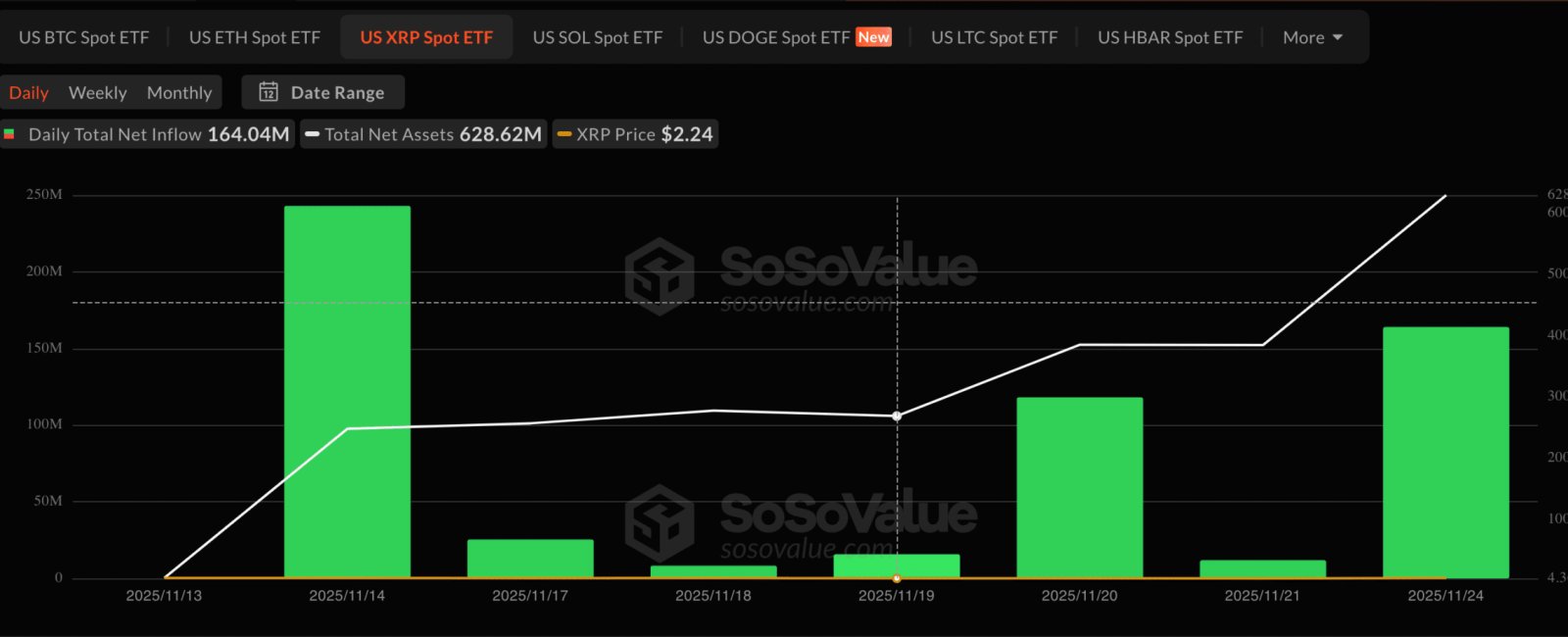 According to SoSoValue data,  spot XRP ETFs pulled in $164 million in net inflows on November 24. This marks one of the biggest single-day totals since launch.