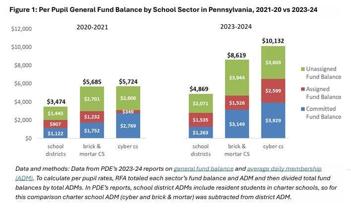 The report follows three distinct types of fund balances: committed fund balance, assigned fund balance, and unassigned fund balance. In the 2023-24 year, school districts had on average $1,263 in committed funds, $1,535 in assigned funds, and $2,071 in unassigned funds, for a total of $4,869. Cyber charters in that same year banks an average of $3,929 in committed funds, $2,599 funds, and $3,603 in unassigned funds, for a total of $10,132.