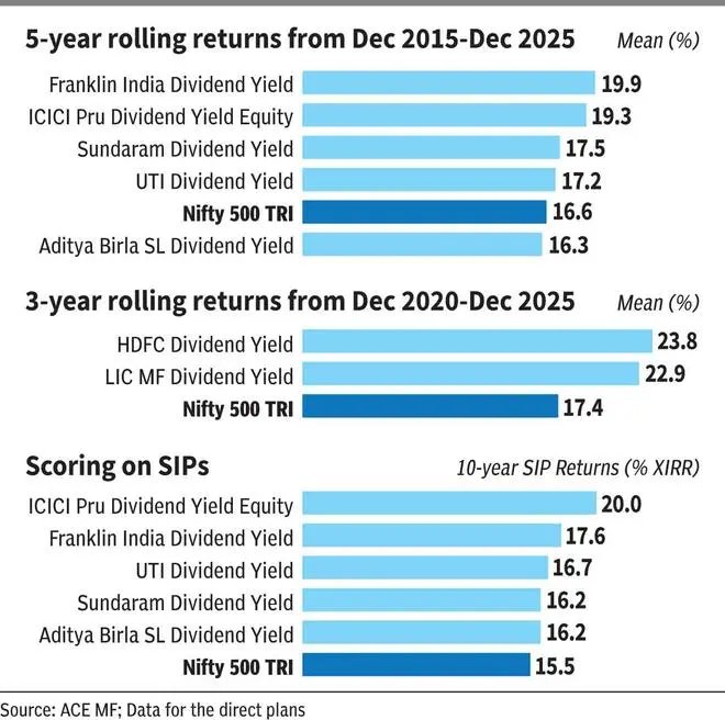 When 5-year rolling returns over December 2015 to December 2025 are considered, the mean returns scored by four of the five dividend yield funds – ICICI Prudential, Franklin India, Sundaram and UTI – ranged between 17.2 per cent and 19.9 per cent.