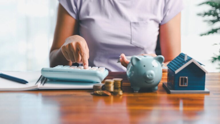 A person using a calculator with a piggy bank, stacks of coins, and a model house on a wooden table.