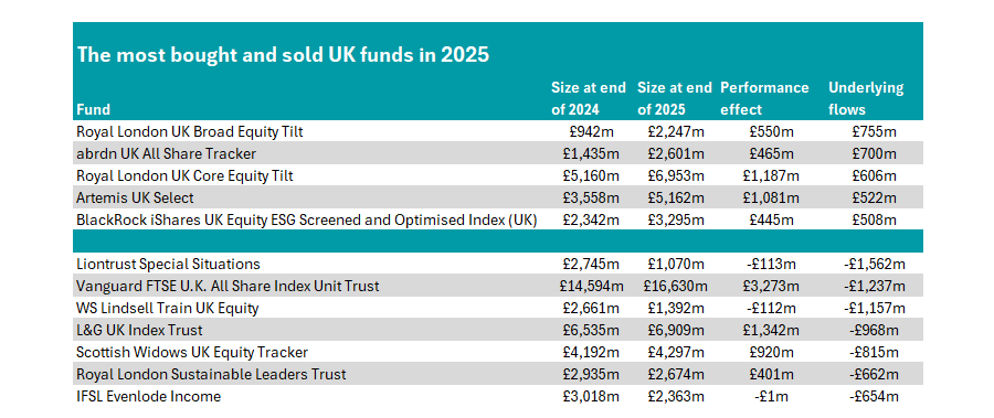 Abrdn UK All Share Tracker was the only traditional equity tracker on the list (£700m new inflows in 2025), while iShares UK Equity ESG Screened and Optimised Index (UK) garnered £508m in net new cash over the course of 2025. It tracks the Morningstar UK ESG Enhanced Index.