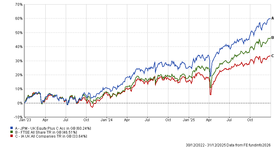 Performance of JPM UK Equity Plus over three years to end-2025