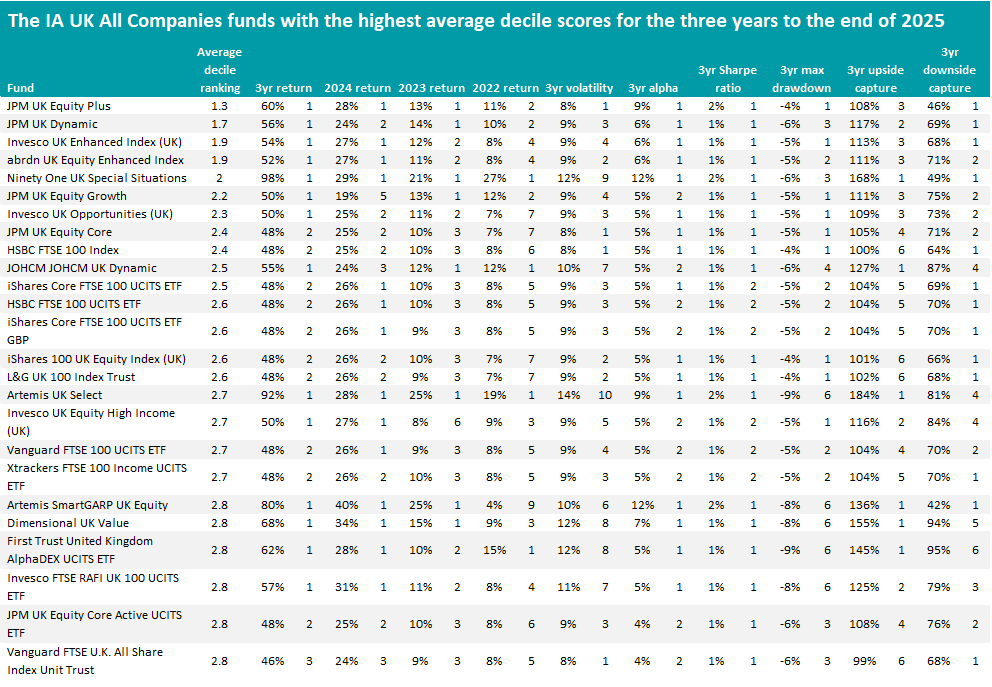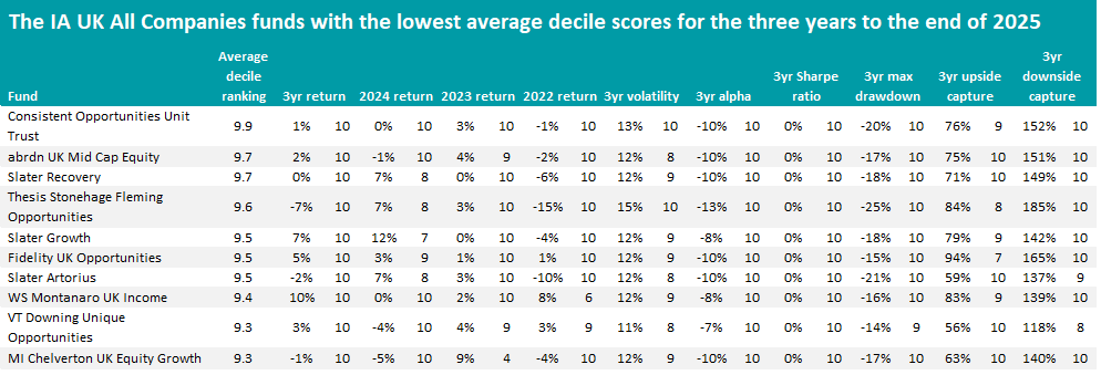 Of course, not every fund can outperform. The table below shows the funds with the highest average decile scores in the IA UK All Companies sector.