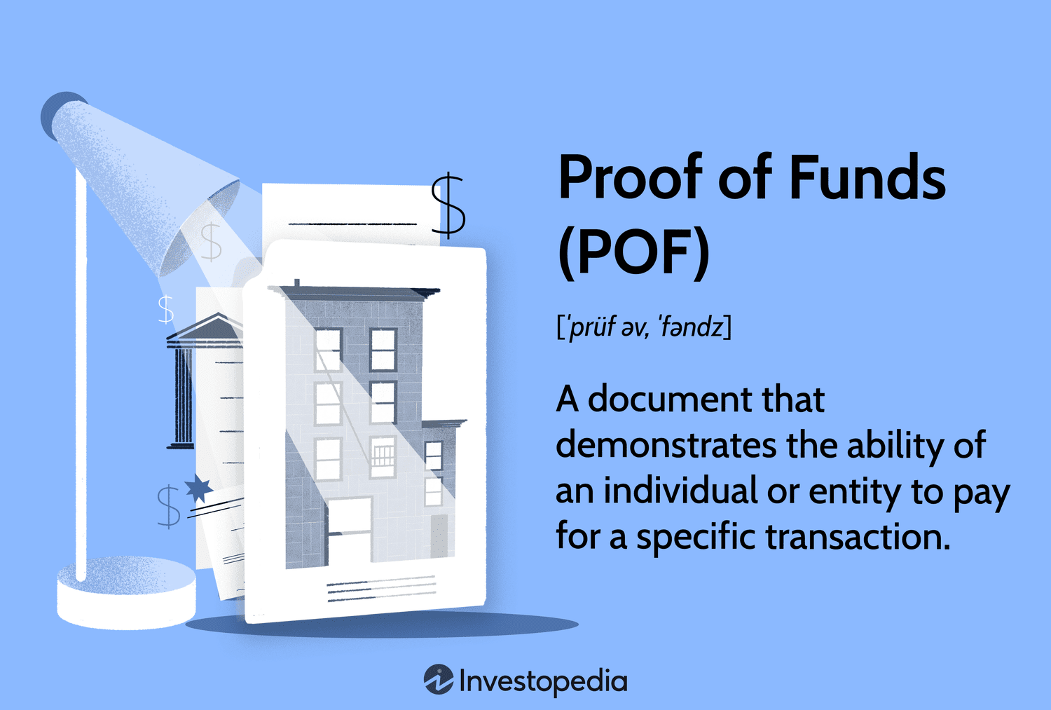 - Proof of funds (POF) is a document that verifies the financial ability to complete a transaction and is typically composed of bank or investment statements.
