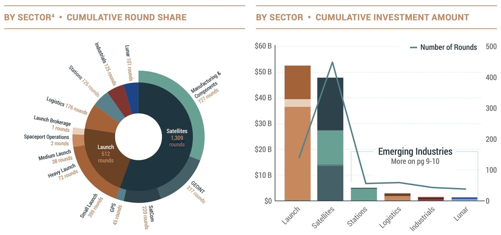 The emerging industries subset of the firm’s infrastructure category, including space stations and on-orbit logistics, has also expanded rapidly to represent 22% of total rounds, up from low single digits five years ago.