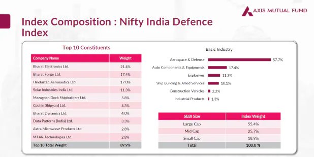 The top 10 constituents account for 89.9% of the index’s total weight, making it highly concentrated. The heaviest individual holdings are Bharat Electronics (21.4%), Bharat Forge (17.4%), Hindustan Aeronautics (17%), and Solar Industries (11.3%).