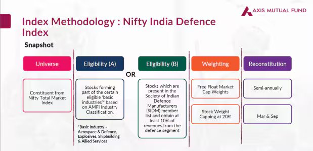 The Nifty India Defence TRI is a thematic benchmark that tracks the performance of portfolio stocks that broadly represent the defence theme in India. It serves as the primary underlying benchmark for the Axis Nifty India Defence Index Fund.
