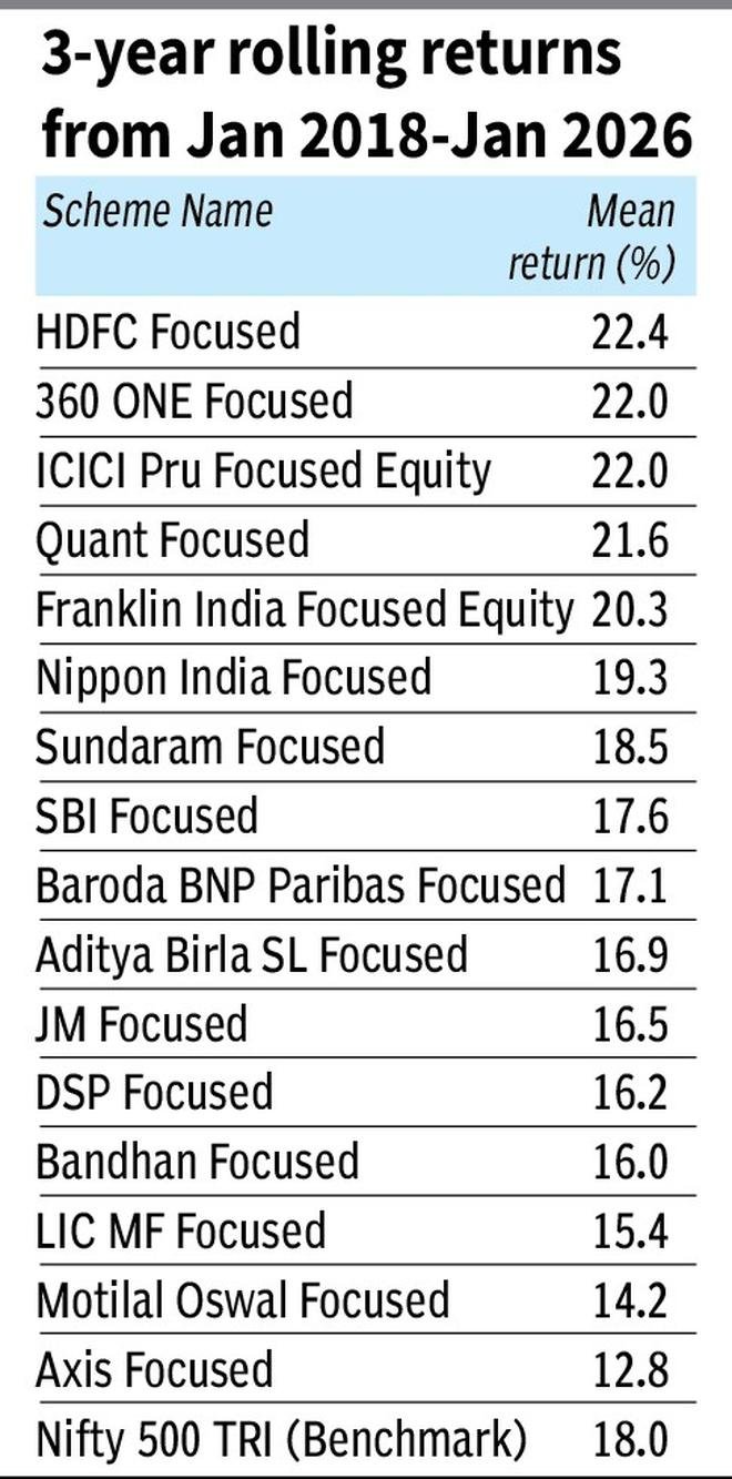 On a point to point basis, focused funds delivered 10.6 per cent to 17.5 per cent returns compounded annually from January 2018-January 2026. The benchmark Nifty 500 TRI gave 13.5 per cent returns in the same period.