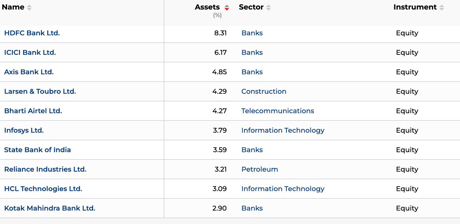 The top 10 stocks are currently 48.5%, and include names such as ICICI Bank, HDFC Bank, Axis Bank, SBI, SBI Life Insurance Company, etc.