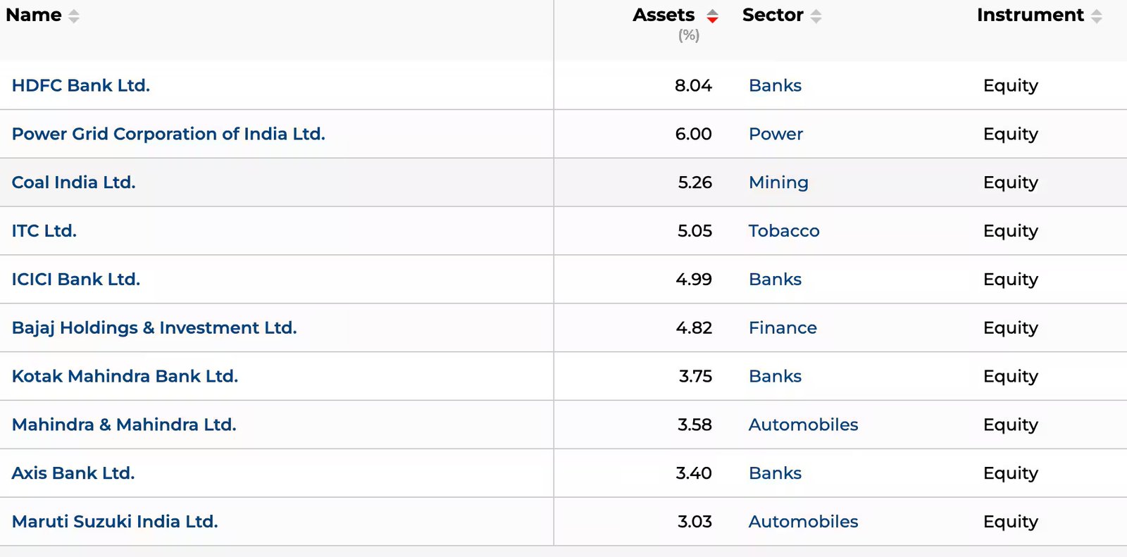 The top 10 stocks are currently 48%, and include names such as HDFC Bank, Power Grid, Coal India, ITC, etc., making it fairly diversified.