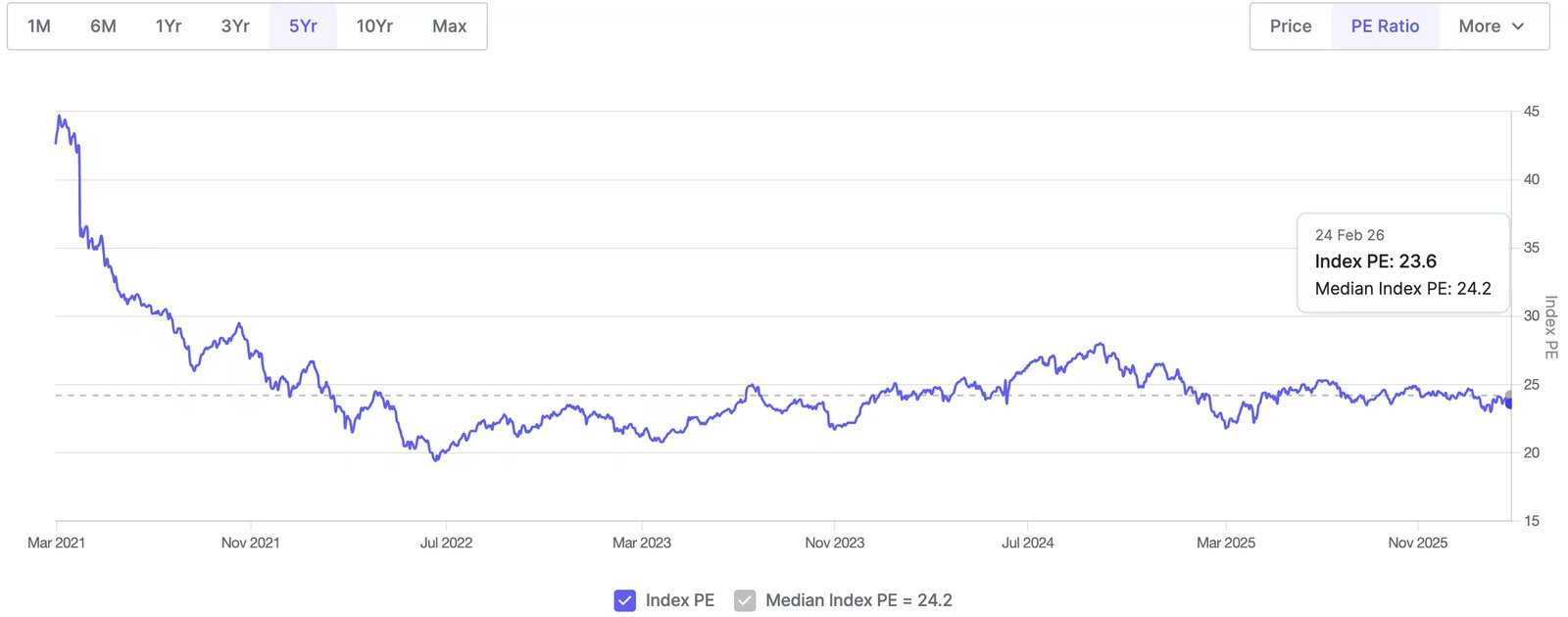 The price-to-equity (PE) ratio of the Nifty 500 index is currently at 23.6 (as of 24 February 2026), near the 5 –year median, down from 28 at the peak in September 2024.