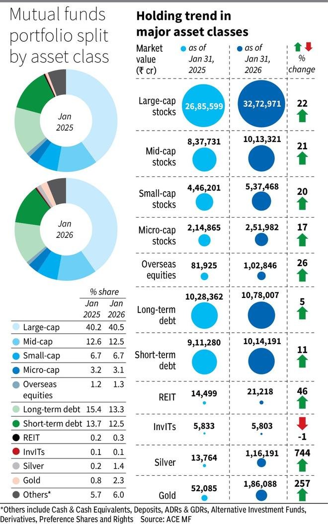 Mutual fund large-cap holdings rose 22 per cent to ₹32.7 lakh crore in the year ended January 2026, the strongest growth among market-cap segments. Amid volatility and valuation concerns in broader markets, fund managers gravitated toward large caps offering earnings visibility and relative valuation comfort.