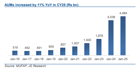 According to JS Global, expansion has enabled the equity market to absorb foreign outflows and has supported the re-rating of the KSE-100 Index amid improving macroeconomic stability. The index delivered a cumulative return of 331 percent over the 2022–2025 period, with mutual fund inflows emerging as a key supporting factor.