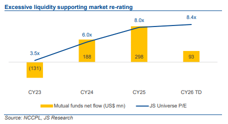 Improved domestic liquidity and stronger equity market appeal have contributed to a broad-based re-rating of the market, with valuations rising from 3.5 times in December 2023 to 8 times in December 2025.
