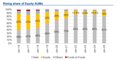 As a result, equities’ share of total AUMs rose from a low of 10 percent in December 2023 to 15 percent currently. However, this remains well below the 40–50 percent levels recorded during the 2016–2018 period.