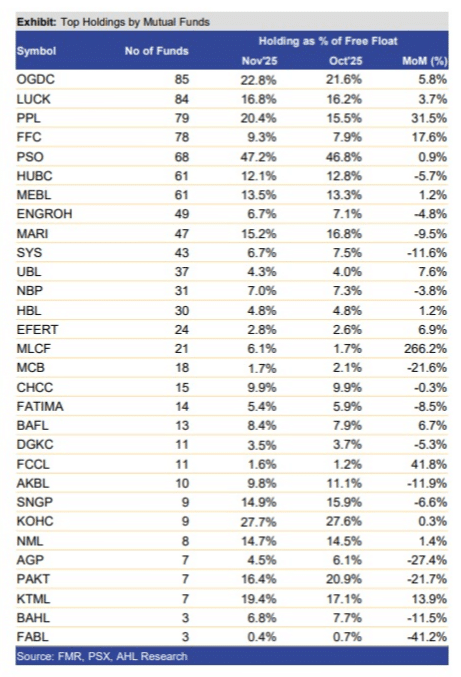 The report is based on mutual fund holdings for November and draws data from fund manager reports, the Pakistan Stock Exchange and AHL Research analysis.