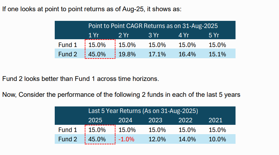 Though Fund 2 looks better than Fund 1 across time horizons. However, we know that fund 1 has been more consistent, HDFC Securities adds.