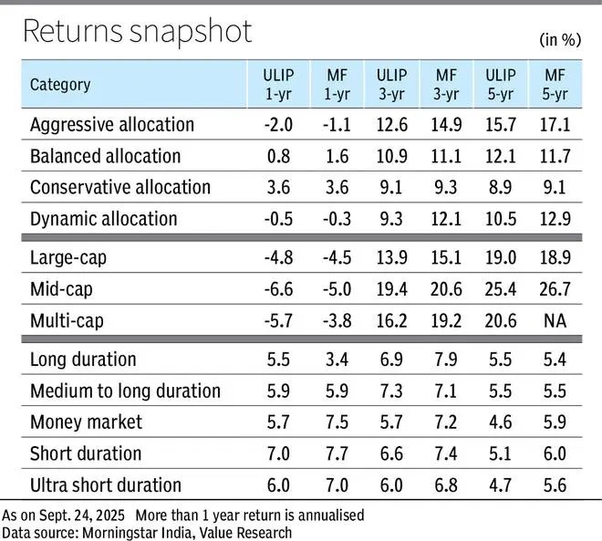 Aggressive allocation ULIPs returned –2.0 per cent, 12.6 per cent and 15.7 per cent over one, three and five years; mutual funds did better at –1.1 per cent, 14.9 per cent and 17.1 per cent. Balanced ULIPs at 0.8 per cent, 10.9 per cent and 12.1 per cent were close to funds at 1.6 per cent, 11.1 per cent and 11.7 per cent. Conservative ULIPs delivered 3.6 per cent in the past year against 3.6 per cent for funds, with three- and five-year averages converging around 9 per cent. Dynamic allocation shows the widest gap: ULIPs at –0.5 per cent, 9.3 per cent and 10.5 per cent over one, three and five years versus –0.3 per cent, 12.1 per cent and 12.9 per cent for funds.