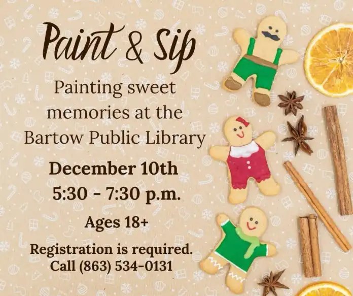 The Bartow Public Library is inviting the community to get into the holiday spirit with its upcoming December Paint and Sip, a free creative event designed for adults. Scheduled for December 10 from 5:30–7:30 p.m., the session gives participants a chance to unwind, sip, and create festive artwork perfect for decking the halls.